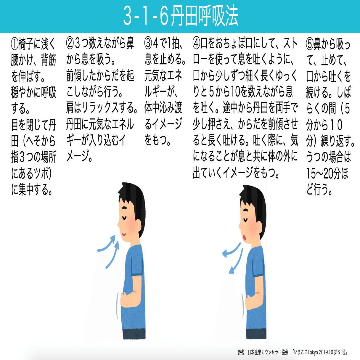 実践方法はシンプルです。椅子に腰かけ、背筋を軽く伸ばし、両足を床につけます。へそから指3本下にある「丹田」に意識を向け、鼻から3秒息を吸ってお腹をふくらませ、1秒止めてから、口から6秒かけて細く長く吐き出します。吸うよりも吐くを長くすることがポイントです。添付資料もご参照ください。