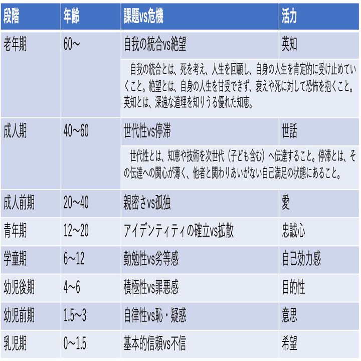 取り上げたいのは、身辺自立と精神的自立である。身辺自立とは、自分のペースで日常生活が送れることを意味する。これは精神的自立と相関があるように思う。精神的自立は、エリクソンの心理社会的発達理論(ライフサイクル論)と連結させると理解しやすい。アイデンティティとの関係性が強いと思う。