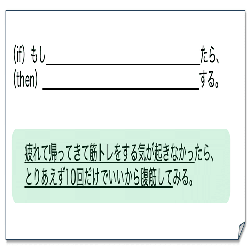 「(if)もしXが起きたら、(then)行動Yをとる」と、前もって決めてノートに書いておくことで、行動を促す手法です。